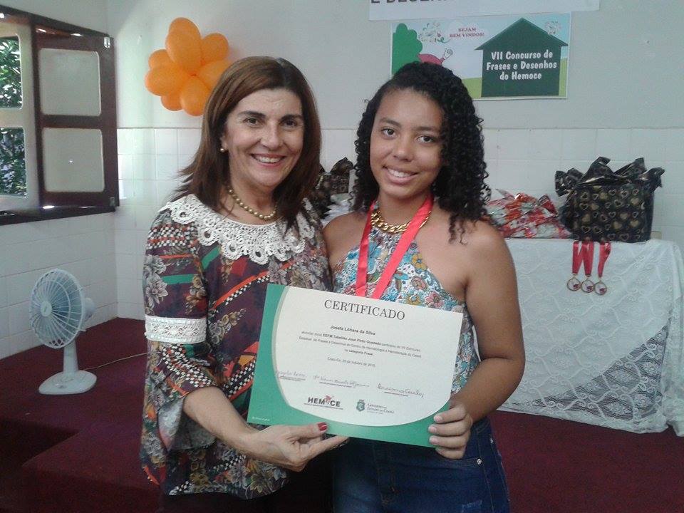 A aluna do 3º ano, Josefa Lohara da Silva, foi uma das vencedoras do concurso de frases do Hemoce. O concurso ocorre todos os anos e objetiva sensibilizar a juventude quanto à doação de sangue.